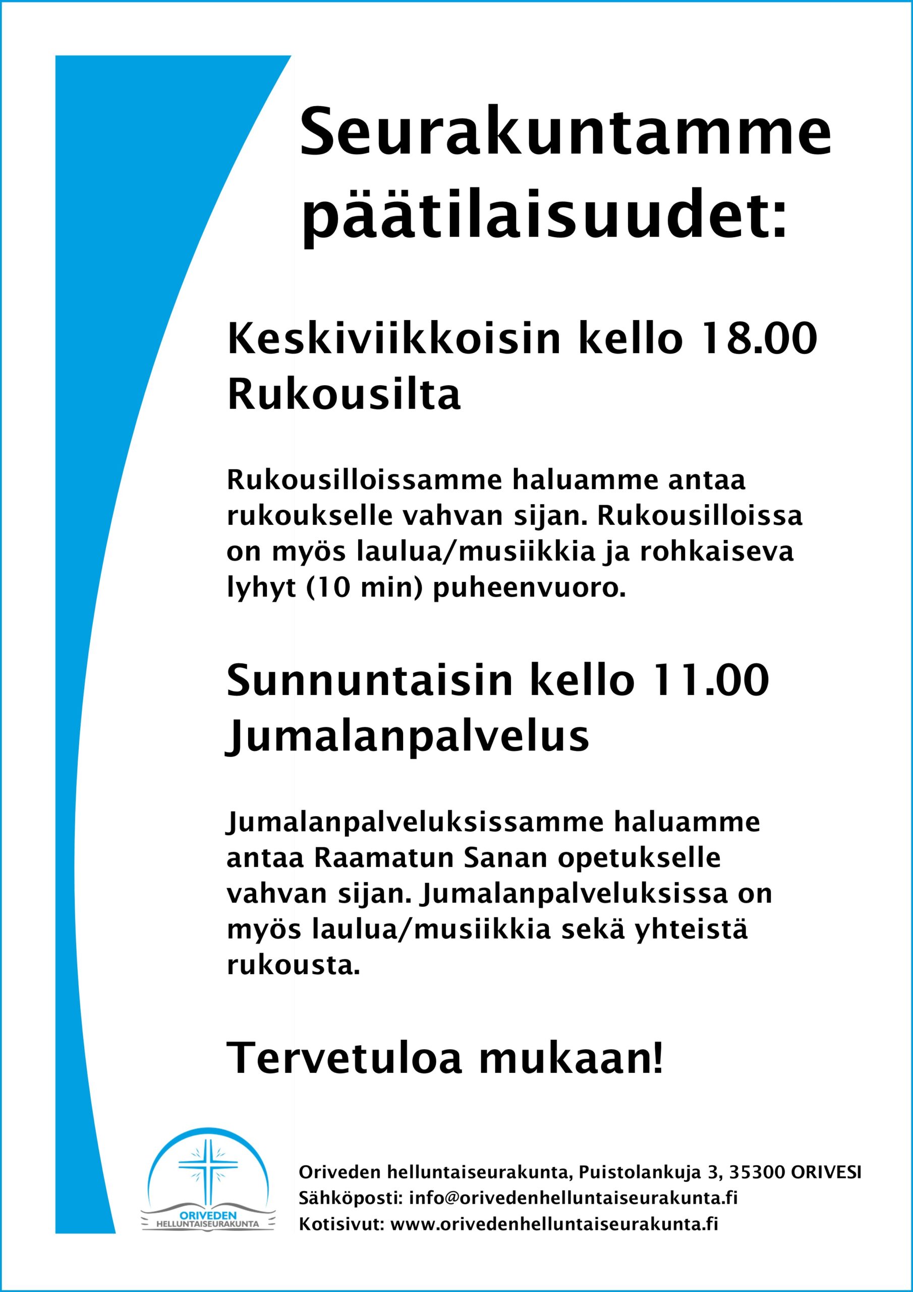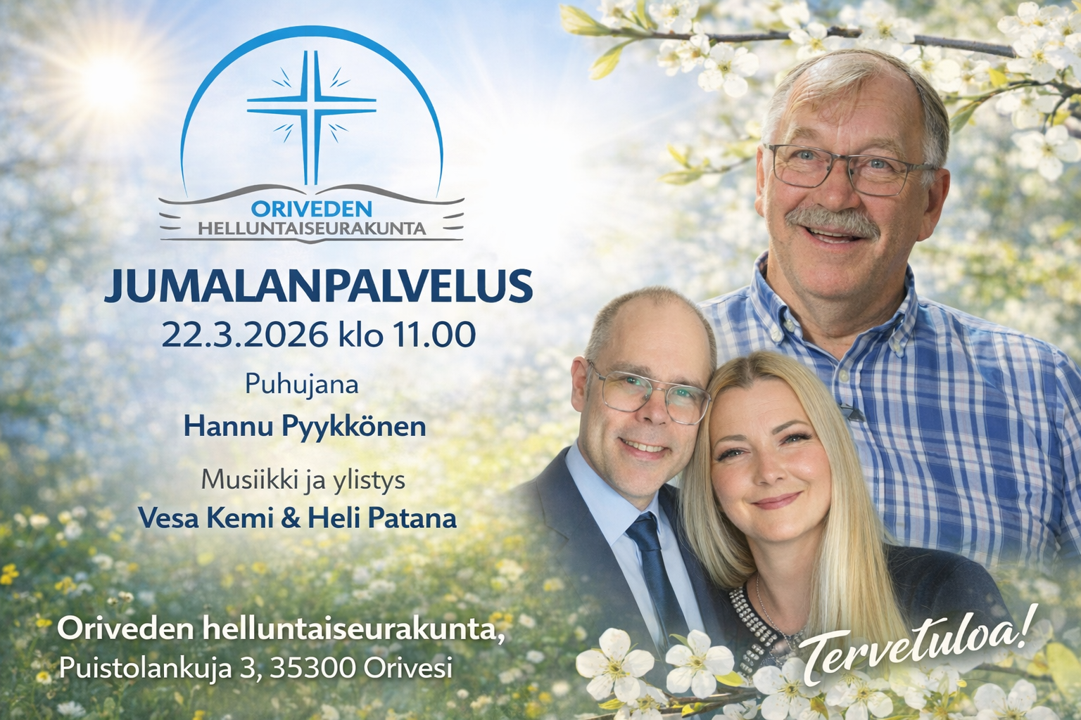 Tervetuloa Jumalanpalvelukseen 22.3.2026 kello 11.00. Tilaisuudessa puhuu Hannu Pyykkönen ja musiikista sekä ylistyksestä vastaavat Vesa Kemi & Heli Patana. Tule mukaan yhteiseen hetkeen Jumalan sanan, rukouksen ja ylistyksen äärelle. Olet lämpimästi tervetullut!