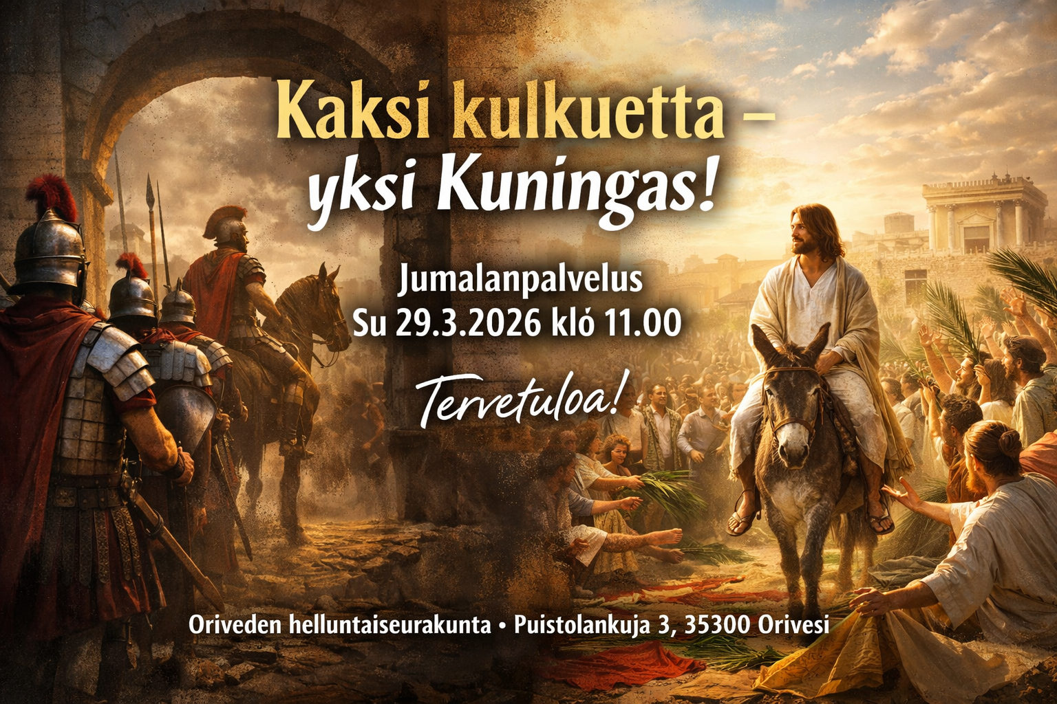 Tervetuloa Jumalanpalvelukseen 29.3.2026 kello 11.00. Jerusalemissa kulki kaksi kulkuetta: toinen vallan ja pelon, toinen nöyryyden ja rauhan. Kumpaa kuningasta maailma seuraa ja kumpaa sinä seuraat? Tule mukaan Jumalanpalvelukseen kuulemaan Palmusunnuntain voimakas sanoma.